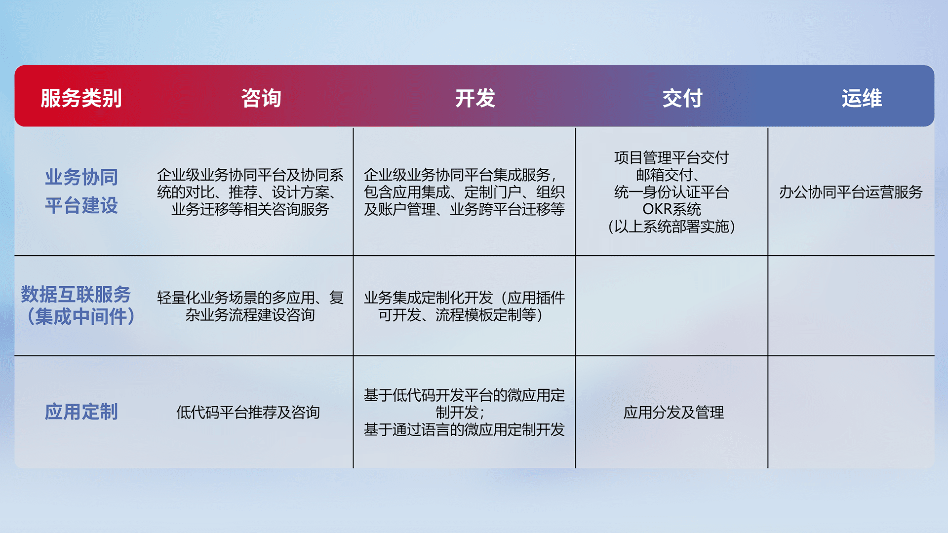 针对钉钉、、、企微、、IDaas等平台级产品提供产品的规划、、、方案、、交付、、、、定制化开发等服务,,实现如统一协同办公、、、智能客户服务、、混合会议管理、、、、智能数据查询、、等业务场景,,实现数字化转型。。。。