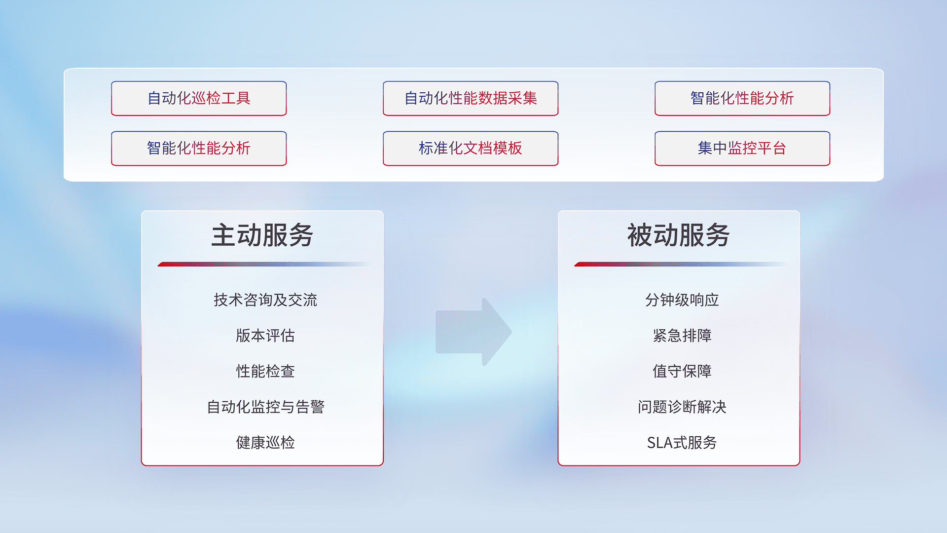 智能化工具和标准化文档,,,保障服务质量,,,提供主动服务(包含技术咨询、、版本评估、、、、性能检查、、、、自动化监控与告警、、、健康巡检)和被动服务包含(分钟级响应、、紧急排障、、、值守保障、、、、问题诊断解决、、、SLA服务)。。。