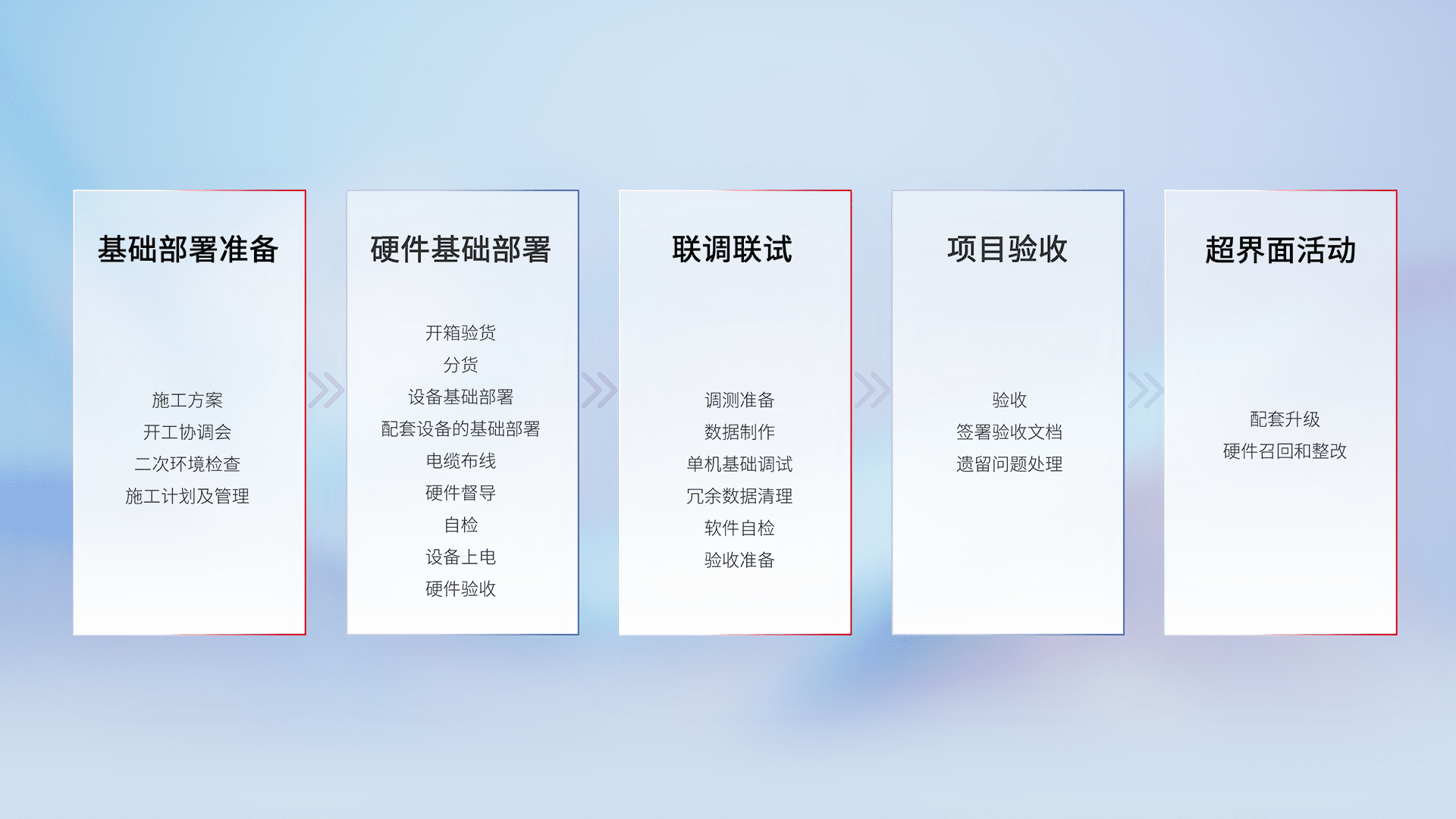 从基础部署准备、、、硬件基础部署、、联调联试、、项目验收、、、、越界面活动的全过程可追溯,,,保证施工质量和进度。。。。